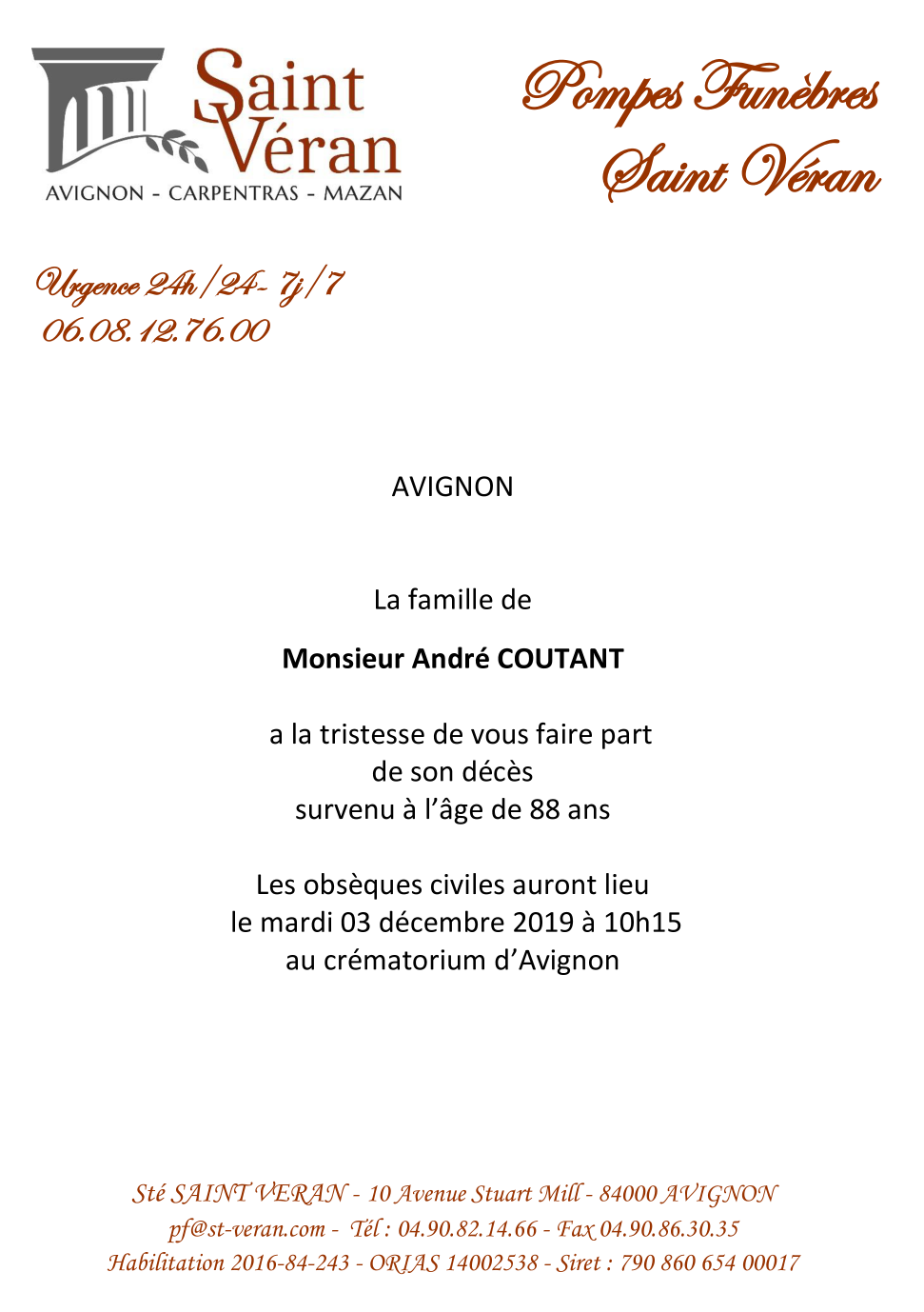 Décédé à Avignon (84000, France) le mardi 26 novembre 2019 à l'âge de 88 ans