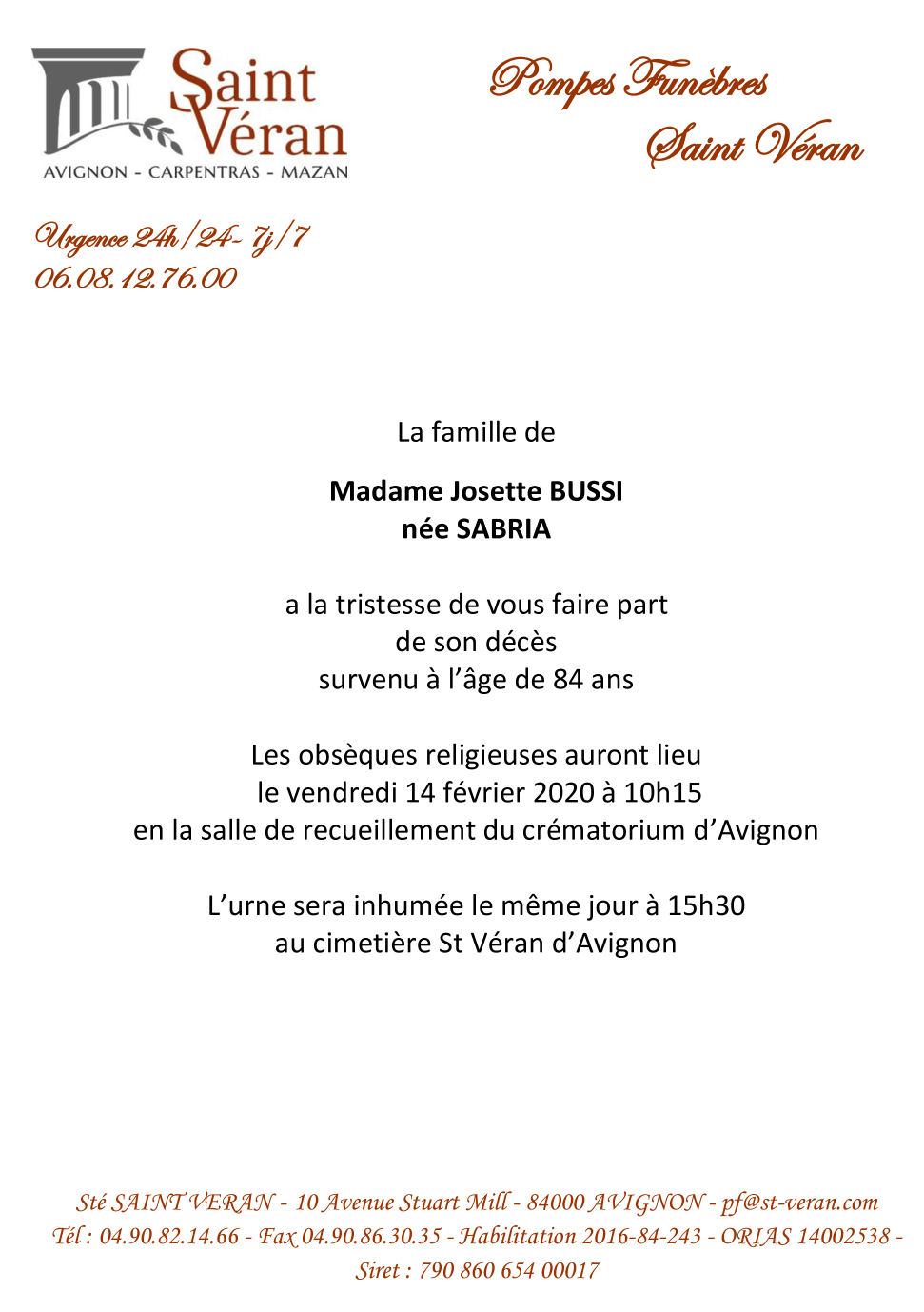 Décédée à Châteaurenard (13160, France) le dimanche 9 février 2020 à l'âge de 84 ans