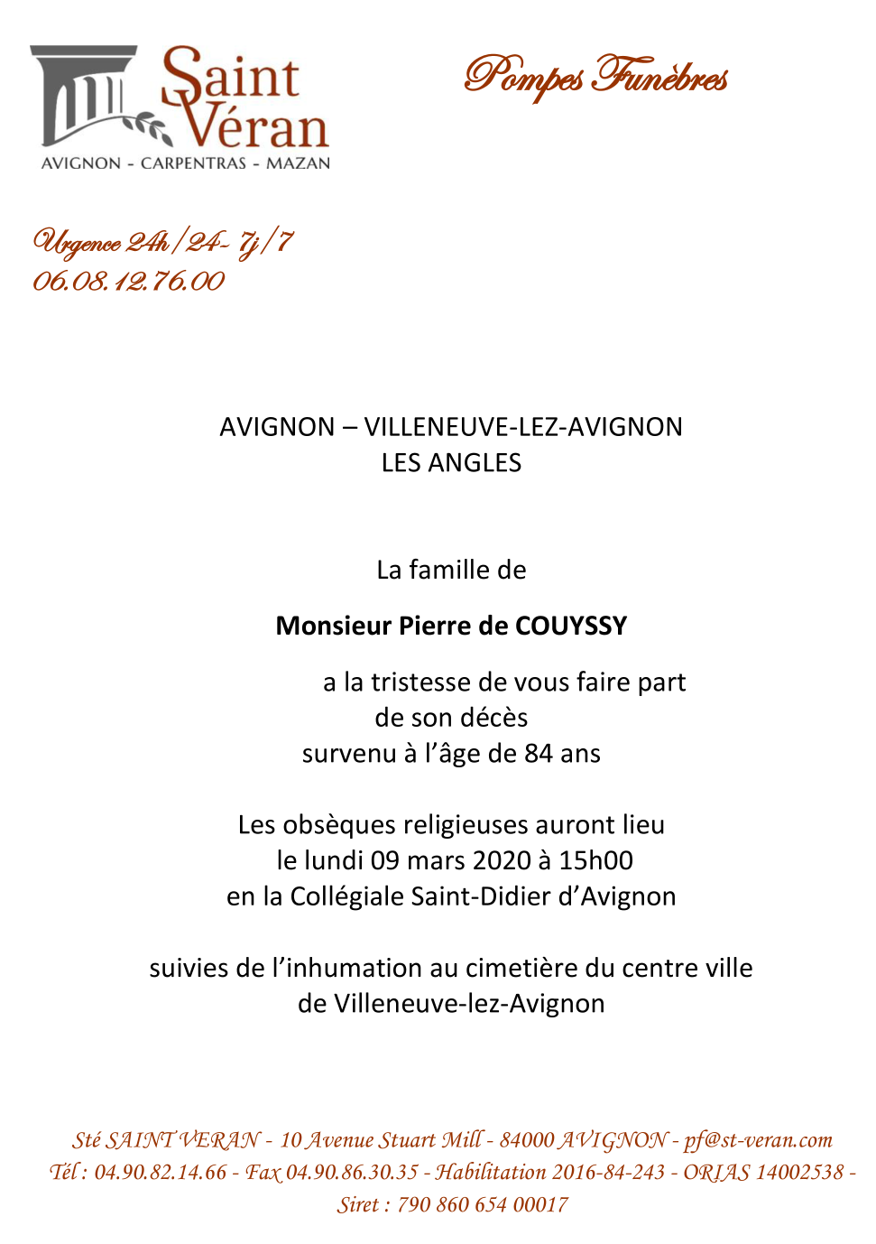 Décédé à Avignon (84000, France) le mercredi 4 mars 2020 à l'âge de 84 ans
